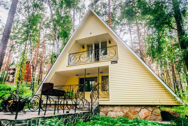 Коттедж №5 Шале с мангалом и баней. Номер площадью 60 м кв. рассчитан на 4 человека и одно дополнительное место. На первом этаже прихожая, кухня и баня. Кухня оборудована электроплитой, микроволновкой, холодильником, чайником, посудой и столовыми приборами. В бане есть душ, комната отдыха и все нужные принадлежности. На втором этаже располагаются две спальни, которые оснащены двуспальными кроватями, шкафом, сейфом, сушилкой и балконом.