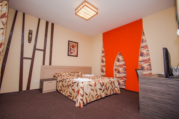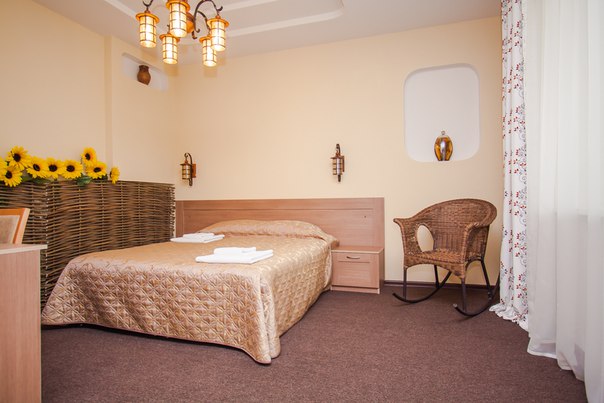 - Номер «Люкс». Двухкомнатный номер на два места площадью 54 м кв. с возможностью двух дополнительных мест. В гостиной платяной шкаф, кресло, диван, чайный сервиз, журнальный стол, ТВ, мини-холодильник. В спальне широкая двуспальная кровать, сейф, шкаф, туалетный столик, сушилка. В ванной душевая кабина, набор косметики, полотенца, фен.