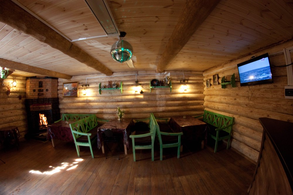 Все деревянные коттеджи оборудованы полностью готовой к использованию кухней с плитой и посудой для готовки пищи. Помимо этого гости базы отдыха могут воспользоваться услугами кафе, расположенного на территории базы. Двухэтажное кафе предлагает блюда с разнообразной кухни (русской, европейской, восточной). Интерьер в кафе стильный и уютный, его украшением является камин большого размера из красивого каслинского литья. В летний период покушать можно на террасе, вместимость которой составляет 80 человек) с которой открывается прекрасный вид на горы и озеро. В здании кафе полсотни посадочных мест для гостей.