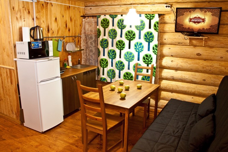 Территория базы отдыха благоустроена, дорожки из тротуарной плитки, зеленые газоны и цветочные клумбы, декоративный пруд. Отдыхающим предлагается размещение в шести деревянных обустроенных коттеджах класса Де-Люкс на два этажа. Первый этаж обладает просторным холлом, кухней, на которой есть плита, холодильник, микроволновая печь и вся нужная посуда со столовыми приборами, рассчитанная на 8 человек. Помимо этого на этаже две удобные диван-кровати, настоящий камин из дерева, туалет и душ. На втором этаже в каждом коттедже две спальни, расположенные раздельно. Есть номера с двуспальными и полуторными кроватями, можно выбрать по своему усмотрению. На кроватях хорошие ортопедические матрасы. Кресло с туалетным столиком есть в каждой спальне. Вместимость домов составляет 6-8 человек.