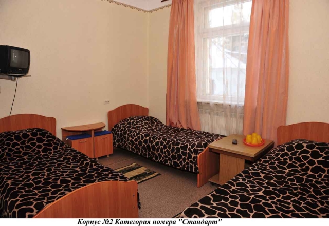 - Номер Стандарт, рассчитанный на 3 человека с раздельными полуторными одноместными кроватями, телевизором, санузлом и душем, холодильником, постельным бельем, полотенцами. Питание не предусмотрено.