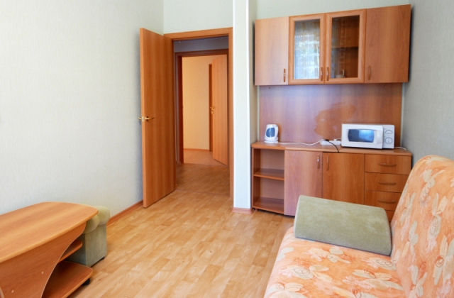 В номере есть: 2 комнаты с отдельной спальней для родителей и комнатой отдыха, шкаф для одежды, сан.узел с ванной, встроенная кухонная зона, печь СВЧ, чайник, холодильник, телевизор, столик, тумбы, диванчик.